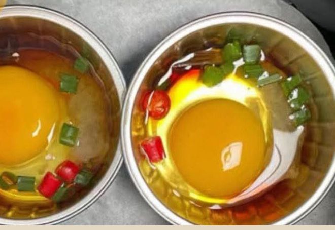 Cho nguyên liệu trứng gà vào từng khuôn. Thêm 1 thìa nước tương ( thìa cafe), 1 thìa dầu mè, 1 ít hành lá, tôm và ớt xắt.